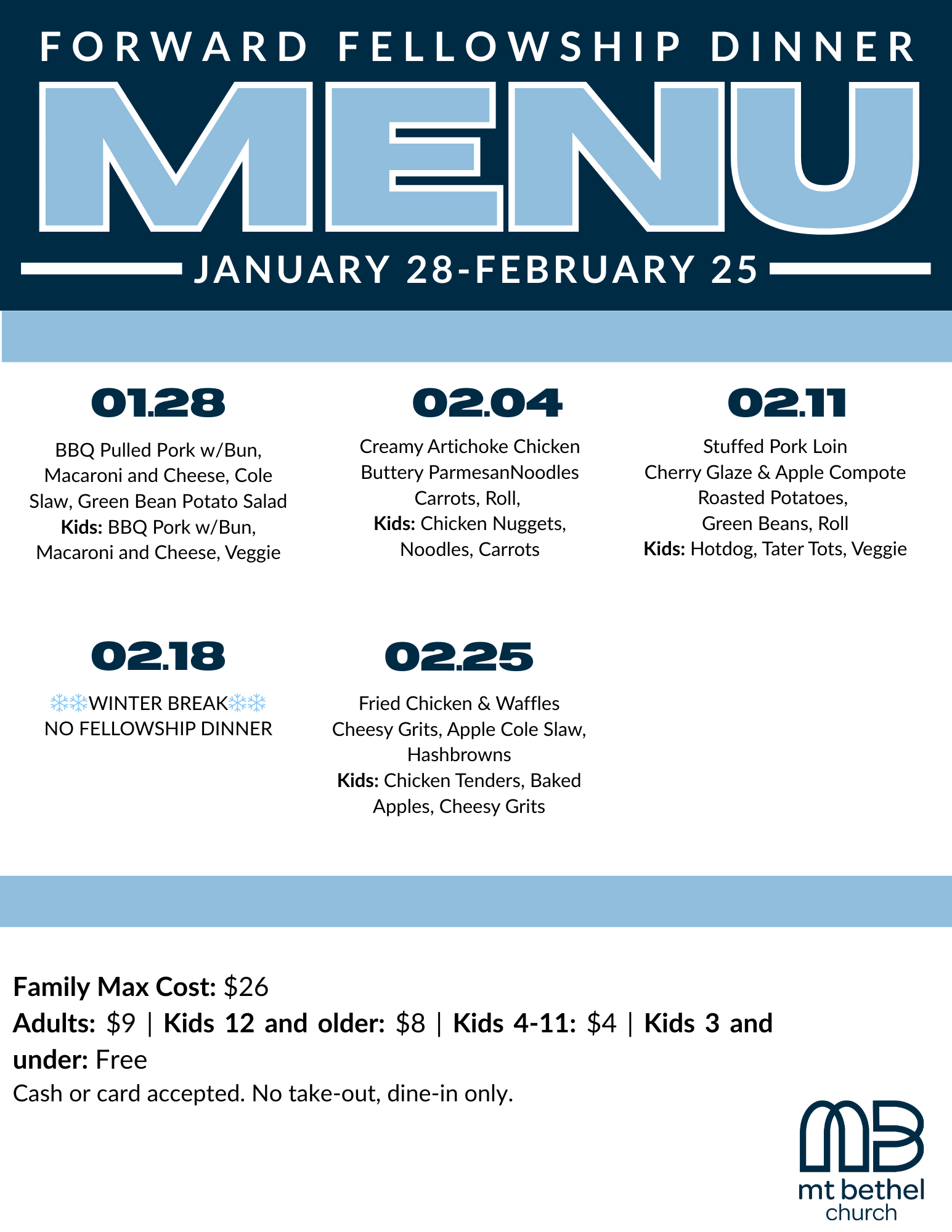 You are invited to join us for dinner from 4:30 to 6:30pm in the Fellowship Hall. You’ll have the chance to meet new people and create meaningful connections.